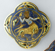 The elaborate enamelled decoration comprises a centaur (with the body of a lion rather than a horse) to dexter reguardant with shield (with traces of blue enamel in the centre and white enamel border) in left hand and club in right on a blue field. The head of the centaur is modelled in relief on the gilded head of a separate copper-alloy rivet (flattened on reverse), with traces of engraving delineating the features. The upper part of the centaur is filled with green enamel with bordering yellow enamel. The lion-like lower body has a bifurcated tail, a surviving patch of blue and white enamel on the upper part of the near foreleg and a patch of green and yellow enamel on the upper part of the near rear leg. Probably manufactured at Limoges.