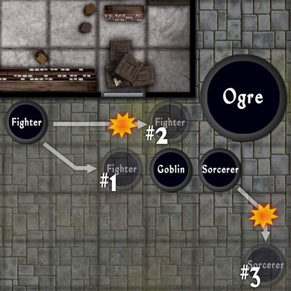 In this combat, the fighter and the sorcerer fight an ogre and his goblin buddy. |