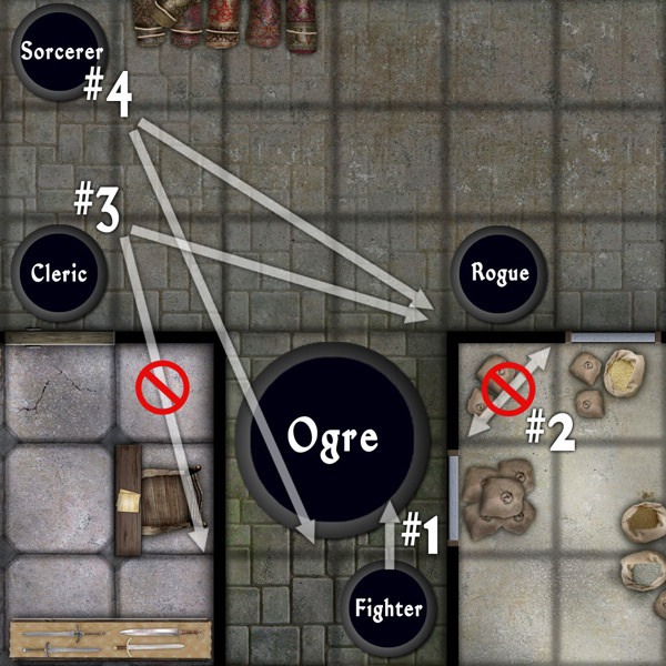 #3: The sorcerer moves away using a withdraw action. The first square she leaves is not threatened as a result, and she can thus move away from the goblin safely, but when she leaves the second square, she provokes an attack of opportunity from the ogre (who has 10 feet of reach). She could instead limit her movement to a 5-foot step, as a free action, and not provoke any attacks of opportunity. |