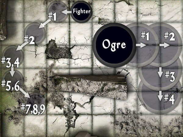 #1: The fighter can safely approach this way without provoking an attack of opportunity, as he does not pass through a square threatened by the ogre (who has 10 feet of reach) or the goblin. |