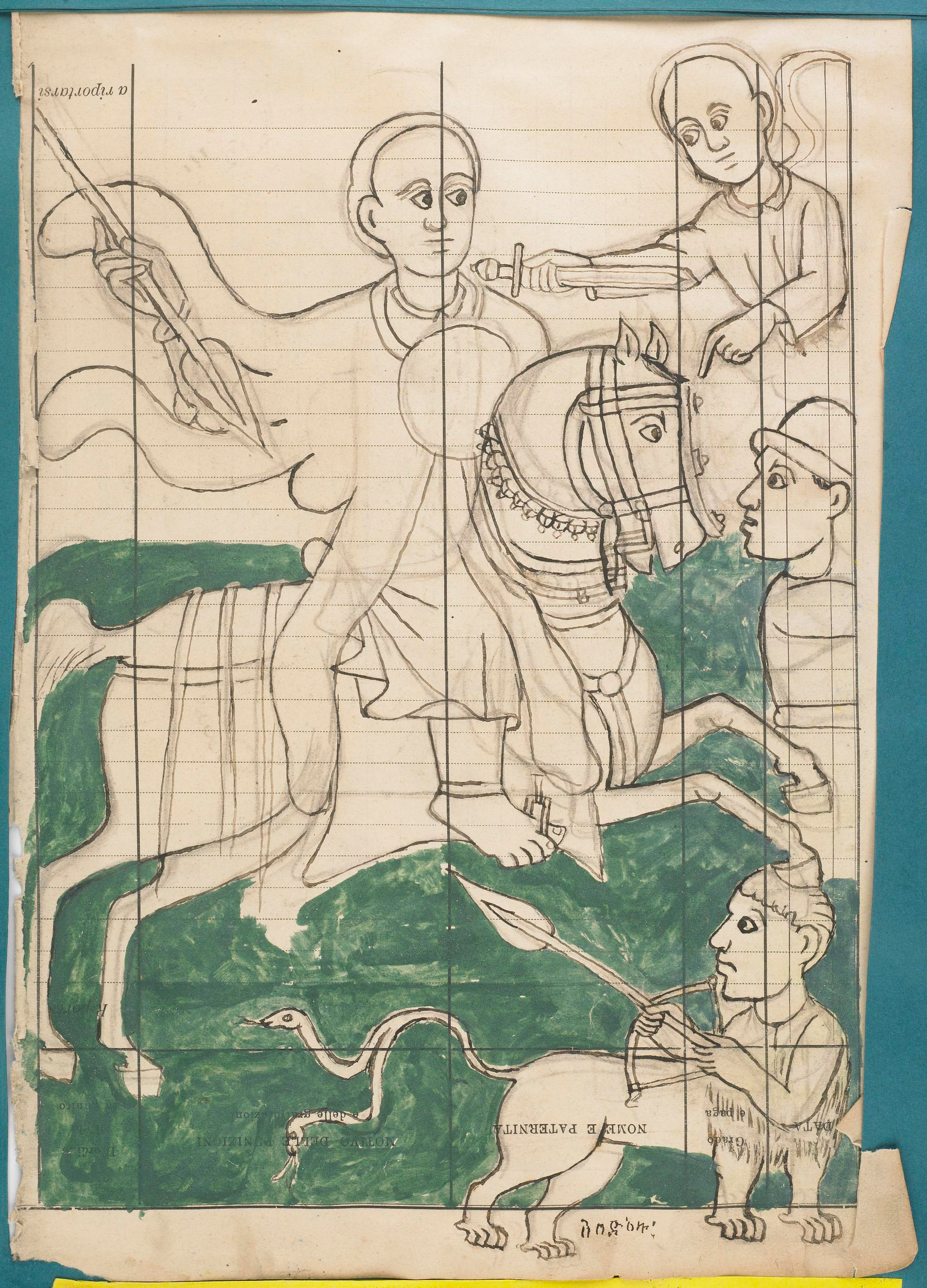Description: Painting in water based pigment on printed Italian military paper depicting Saint Claudius riding a horse with Ethiopian toe stirrup and tack. The saint wears a cape (lemd) and carries a spear and shield. To the right an angel passes him a sword. Before the saint is the figure of a man fleeing , below is a creature half man, half lion with a double headed serpant as a tail (Sabade'at).