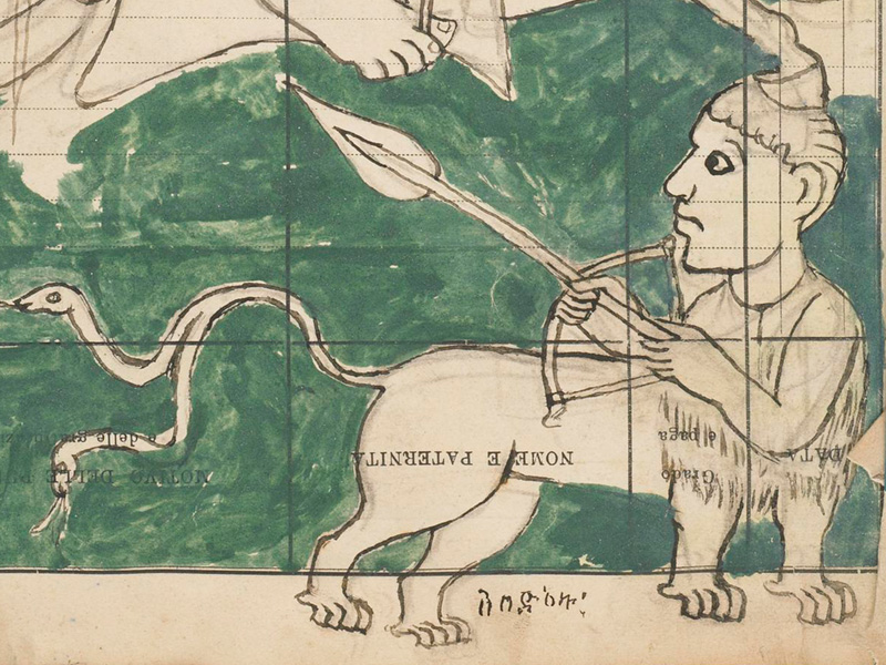 Evidently the term "Sabade'at" is what the Ethiopian church calls a sagittary! But the thing that really gets me is that this lion-centaur, drawn in the medieval style, was created by an African priest in 1940! That's a survival from 500 years earlier! What's going on with the bifurcated snake tail, I don't know, but this is still clearly within the tradition of medieval grotesques and drolleries!