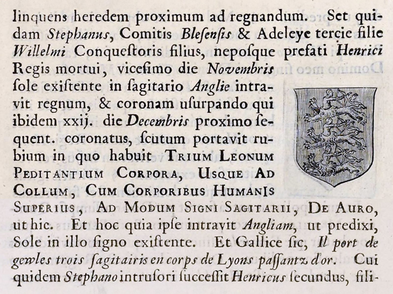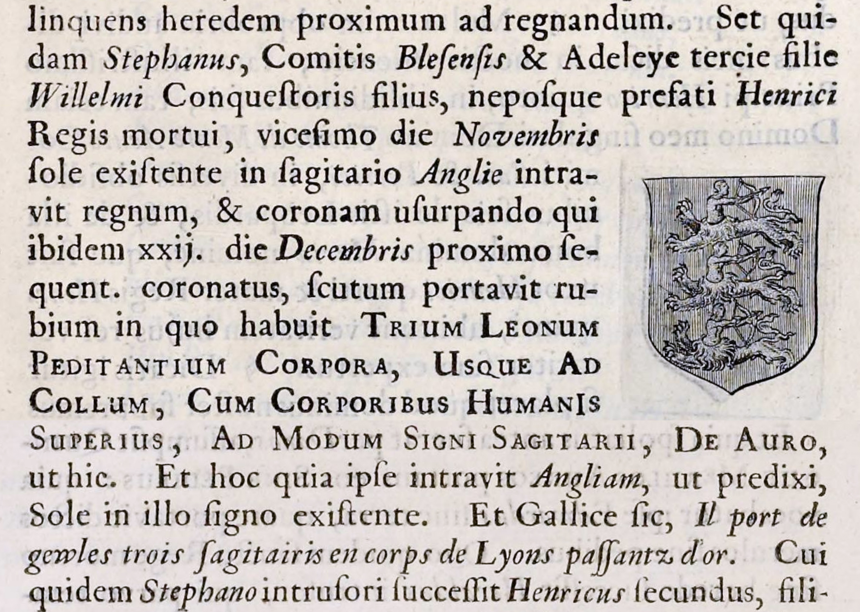 "But a certain Stephen — son of the Count of Blois and Adela, third daughter of William the Conqueror, and nephew of the aforementioned late King Henry — entered the kingdom of England on the twentieth day of November while the sun was in Sagittarius. Usurping the crown, he was crowned there on the twenty-second day of December following. He bore a red shield in which he had THE BODIES OF THREE LIONS WALKING, UP TO THE NECK, WITH HUMAN BODIES ABOVE, IN THE MANNER OF THE SIGN OF SAGITTARIUS, IN GOLD, as here. And this because he himself entered England, as I said before, while the Sun was in that sign. And in French thus: He bears on a red field, three sagittaries with the bodies of golden lions walking."