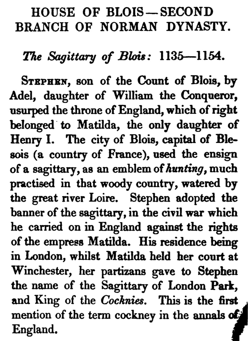 "Stephen, son of the Count of Blois, by Adel, daughter of William the Conqueror, usurped the throne of England, which of right belonged to Matilda, the only daughter of Henry I. The city of Blois, capital of Blesois (a country of France), used the ensign of a sagittary, as an emblem of hunting, much practised in that woody country, watered by the great river Loire. Stephen adopted the banner of the sagittary, in the civil war which he carried on in England against the rights of the empress Matilda. His residence being in London, whilst Matilda held her court at Winchester, her partizans gave to Stephen the name of the Sagittary of London Park, and King of the Cocknies. This is the first mention of the term cockney in the annals of England."