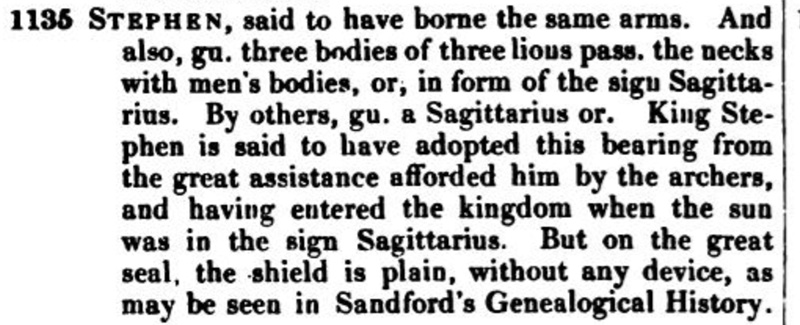Note that Upton's passage, immediately after describing Henry's leonine sagittaries, says, "And this because he himself entered England, as I said before, while the Sun was in that sign." The point is, Upton suggests that Stephen took these sagittaries as his emblem because he ascended the throne in the season of the constellation Sagittarius.