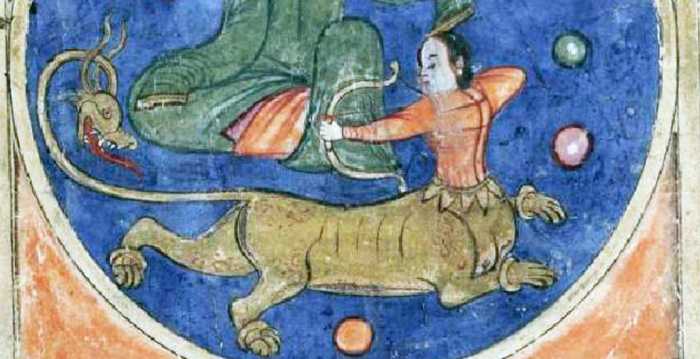 The Sagittarius of the zodiac, the archer, drawing his bow, is at times half man and half horse. At other times, the body is not horse-like but with thick legs and paws and sometimes even spotted fur, like a lion or leopard. The creature is called